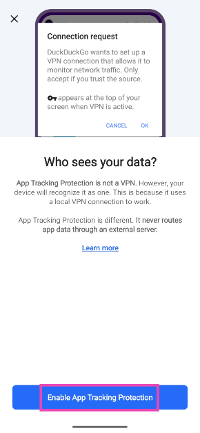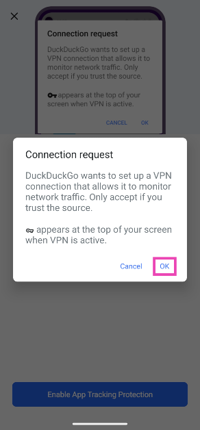 Εκκινήστε το DDG, μεταβείτε στοΡυθμίσεις> Προστασία παρακολούθησης εφαρμογών> Ενεργοποίηση, και αφήστε το πρόγραμμα περιήγησης στο Web να δημιουργήσει μια σύνδεση VPN.
