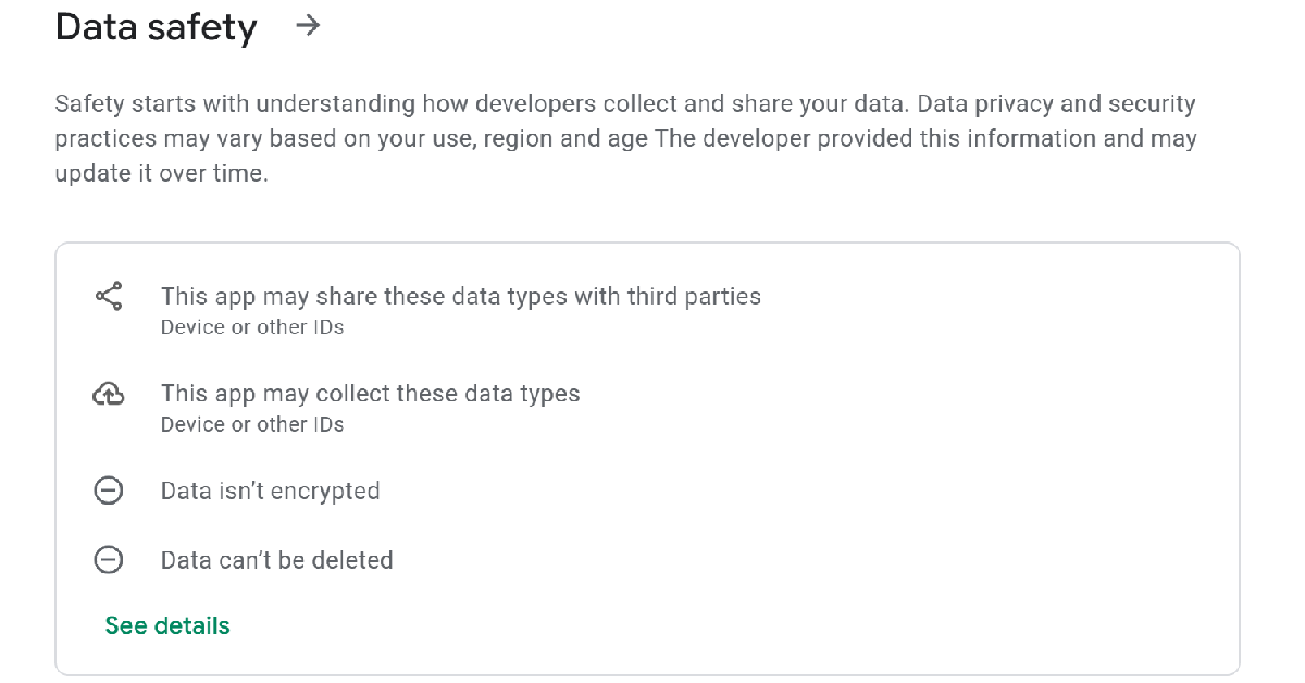 Για να ενθαρρύνουν τους χρήστες να κάνουν καλύτερες επιλογές, το Google Play Store έχει κατηγορία «ασφάλειας δεδομένων» για κάθε εφαρμογή στην πλατφόρμα. Αυτή η ενότητα απαριθμεί τους τύπους δεδομένων που συλλέγει η εφαρμογή και αν μοιράζεται τα δεδομένα σας με άλλα τρίτα μέρη. Κατά την εγκατάσταση μιας εφαρμογής, ρίξτε πάντα μια ματιά στις λεπτομέρειες ασφάλειας των δεδομένων. Εάν μια αβλαβή εφαρμογή (όπως υπολογιστής, επεξεργαστής φωτογραφιών κ.λπ.) μοιράζεται τα δεδομένα σας με τρίτους, είναι καλή ιδέα να αναζητήσετε εναλλακτικές λύσεις.