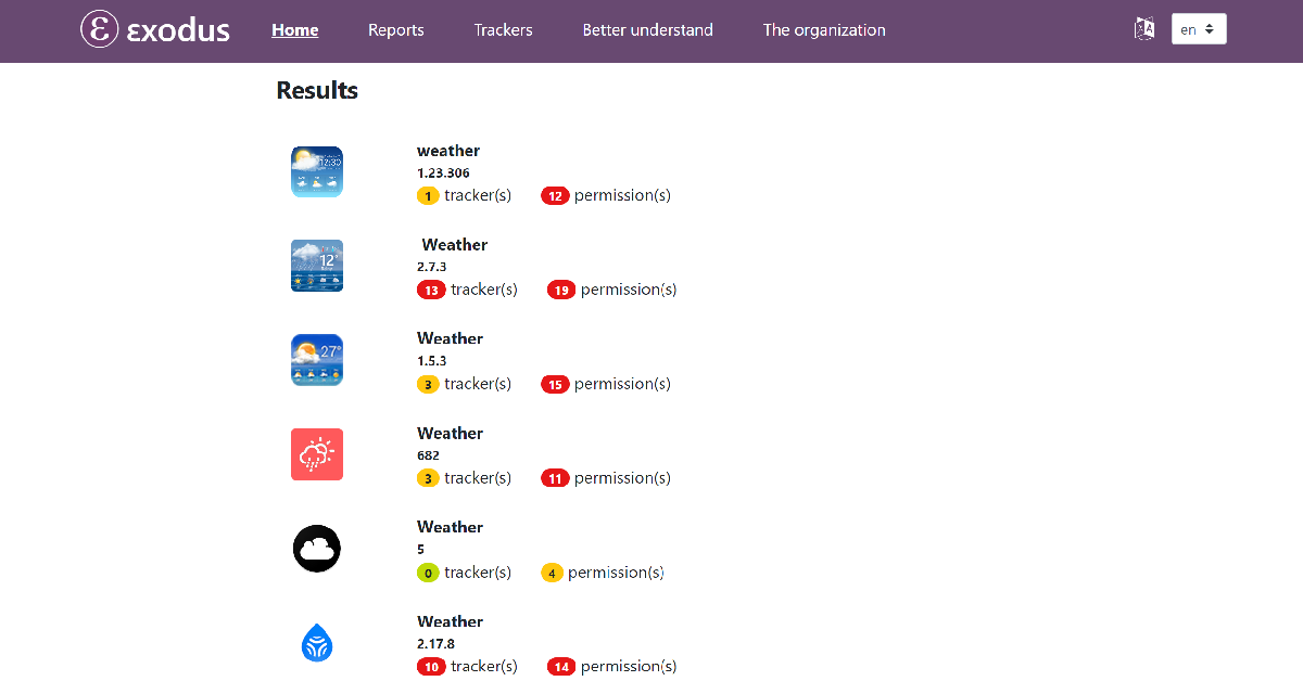 Πηγαίνωhttps://exodus-privacy.eu.org/en/, αναζητήστε την εφαρμογή και επιλέξτε το σχετικό αποτέλεσμα. Θα δείτε τον αριθμό των ιχνηλάτη εντός της εφαρμογής.