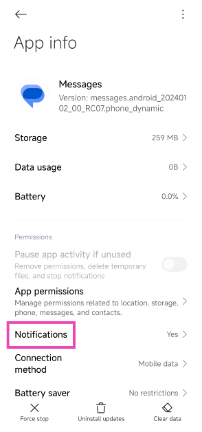 Βήμα 5:Οι κατηγορίες ειδοποίησης θα περιέχουν τα είδηειδοποιήσειςότι η εφαρμογή ωθεί τη συσκευή σας. Για μια εφαρμογή ανταλλαγής μηνυμάτων, αυτό μπορεί να είναι εισερχόμενα κείμενα, ομαδικά κείμενα, εισερχόμενες κλήσεις και πολλά άλλα. Πατήστε στοκατηγορίαγια το οποίο θέλετε να αλλάξετε τον ήχο ειδοποίησης.