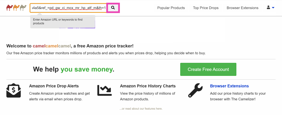 Βήμα 4:Επιστρέψτε στην αρχική σελίδα Camelcamelcamel καιεπικολλήστε τη διεύθυνση URLσε«Βρείτε προϊόντα Amazon»πεδίο κειμένου.