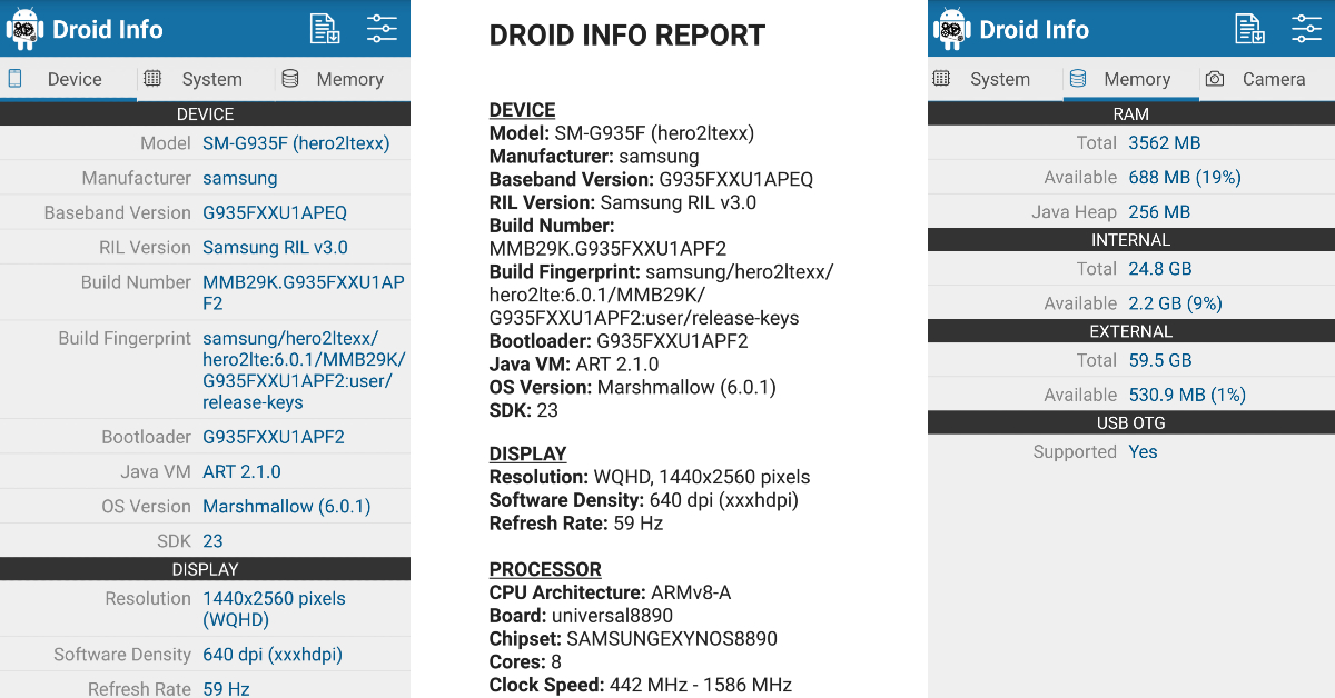 Υπάρχει μια δέσμη εφαρμογών τρίτων που μπορούν να αποκαλύψουν τις πληροφορίες της συσκευής σας με ευκολία.είναι μια από τις καλύτερες εφαρμογές για αυτό το έργο. Μόλις εγκαταστήσετε την εφαρμογή στο τηλέφωνό σας, δώστε την απαραίτητη άδεια να λειτουργήσει σωστά. Κατά την εκκίνηση της εφαρμογής, θα μπορείτε να δείτε όλες τις πληροφορίες συσκευών που σχετίζονται με το σύστημα, τη μνήμη, την κάμερα και πολλά άλλα. Η εφαρμογή θα εμφανίζει τον αριθμό μοντέλου, τον αριθμό δημιουργίας, την έκδοση λειτουργικού συστήματος, το όνομα του κατασκευαστή, την κατασκευή δακτυλικών αποτυπωμάτων και άλλες πληροφορίες.