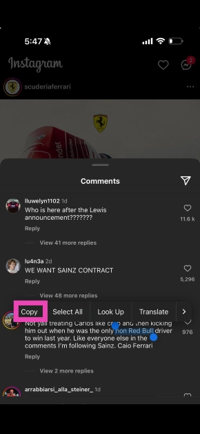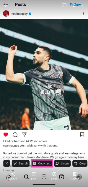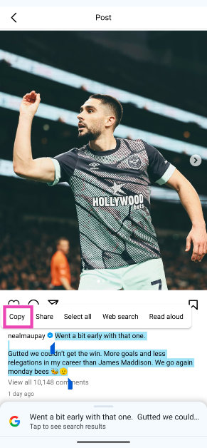 Παραδόξως, αυτή η μέθοδος λειτουργεί μόνο για λεζάντες Instagram. Εάν θέλετε να αντιγράψετε ένα σχόλιο, ακολουθήστε τη μέθοδο που αναφέρεται παρακάτω.