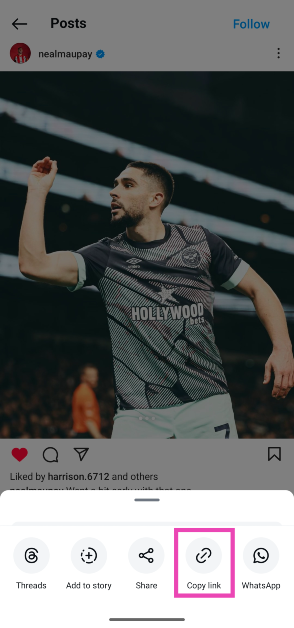 Βήμα 1:Μεταβείτε στην ανάρτηση Instagram που θέλετε να αντιγράψετε. Χτυπήστε τοΚουμπί κοινής χρήσηςκαι επιλέξτεΣύνδεσμος αντιγραφής.