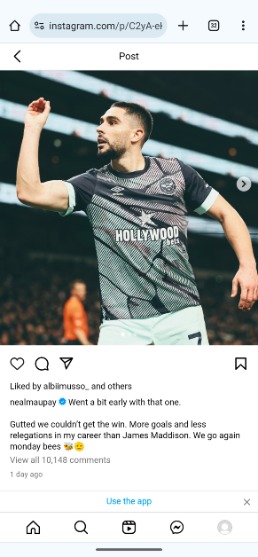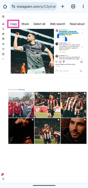 Βήμα 3:Η ανάρτηση Instagram θα ανοίξει στο πρόγραμμα περιήγησης στο Web.Μακρύς Τύποςη λεζάντα για να το επισημάνετε και να επιλέξετεΑντίγραφο.