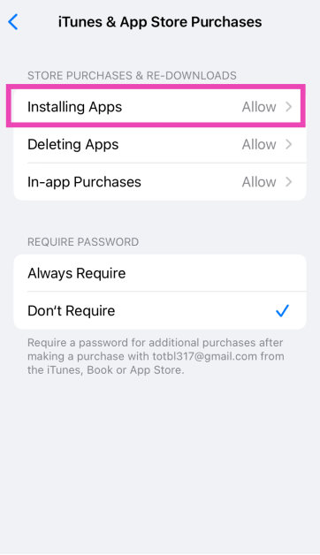 ΠηγαίνωΡυθμίσεις> Χρόνος οθόνης> Περιορισμοί περιεχομένου & ιδιωτικού απορρήτου> Αγορές iTunes & App Store. Πατήστε κατά την εγκατάσταση εφαρμογών και επιλέξτε "Επιτρεπόμενο".