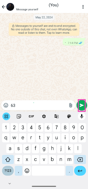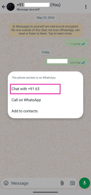 Εάν δεν θέλετε να αποθηκεύσετε κάποιον ως επαφή στο τηλέφωνό σας, απλά στείλτε τον αριθμό του στον εαυτό σας στο WhatsApp και ανοίξτε ένα νήμα συνομιλίας μαζί τους. Εδώ είναι.