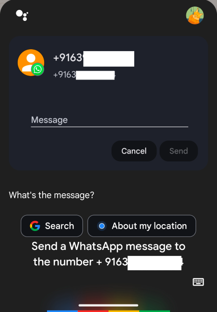 Βήμα 2:ΕΝΑΠλαίσιο κειμένου WhatsappΜε τον αριθμό του χρήστη θα εμφανιστεί στην επόμενη σελίδα. Μπορείτε να επιλέξετε να υπαγορεύσετε το μήνυμά σας ή να το πληκτρολογήσετε χρησιμοποιώντας το πληκτρολόγιο στην οθόνη.