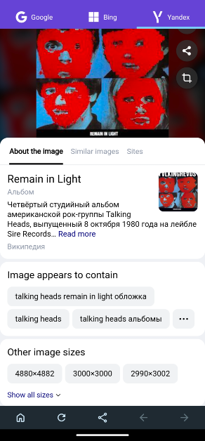 Βήμα 4:Η εφαρμογή θαέρευναΓια την εικόνα σε ολόκληρο τον ιστό χρησιμοποιώντας τις μηχανές αναζήτησης Google, Bing και Yandex. Μπορείτε να αλλάξετε τοκαρτέλαγια να ελέγξετε τα αποτελέσματα από κάθε μηχανή αναζήτησης.