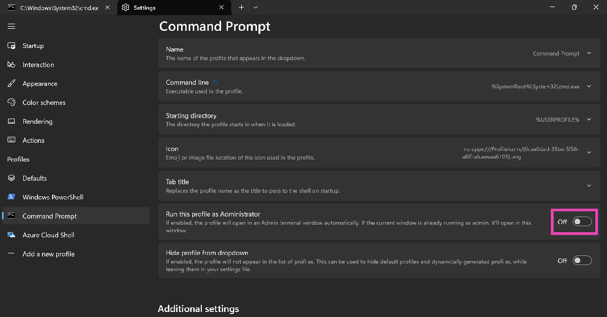 Ανοίξτε το τερματικό, μεταβείτε στοΡυθμίσεις> Προτροπή εντολώνκαι ενεργοποιήστε το διακόπτη εναλλαγής για να «εκτελέσετε αυτό το προφίλ ως διαχειριστή».