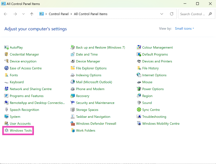 Βήμα 1:Ανοίγω τοΠίνακας ελέγχουστον υπολογιστή σας και επιλέξτεΕργαλεία Windows.