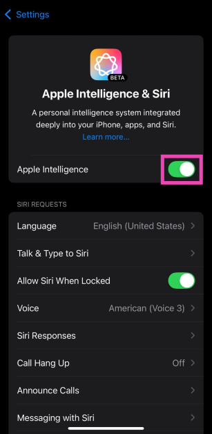 Βήμα 2:Ενεργοποιήστε το διακόπτη εναλλαγής δίπλα στοApple Intelligence.