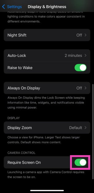 Βήμα 2:Μετακινηθείτε προς τα κάτω και απενεργοποιήστε το διακόπτη εναλλαγής δίπλαΑπαιτούν οθόνηυπό έλεγχο κάμερας.