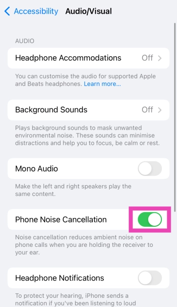 ΠηγαίνωΡυθμίσεις> Γενικά> Προσβασιμότητα> Ήχος/οπτικήκαι απενεργοποιήστε το διακόπτη εναλλαγής για ακύρωση θορύβου τηλεφώνου.