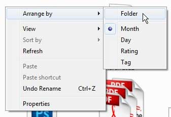 Ο φάκελος εικόνων περιλαμβάνει ένα πρόσθετο στοιχείο στο μενού συντόμευσης που ονομάζεται τοΚανονίζωμενού. Αυτή η επιλογή σάς επιτρέπει να ταξινομήσετε εικόνες σε αυτόν τον φάκελοΜήνας,Ημέρα,ΕκτίμησηήΕτικέτα. Ωστόσο, η επιλογή να ταξινομήσετε τις εικόνες σας με μία από αυτές τις παραμέτρους θα αλλάξει και θα αφαιρέσει μερικά άλλα στοιχεία στο μενού συντόμευσης που πιθανότατα χρησιμοποιείτε για να χρησιμοποιήσετε.