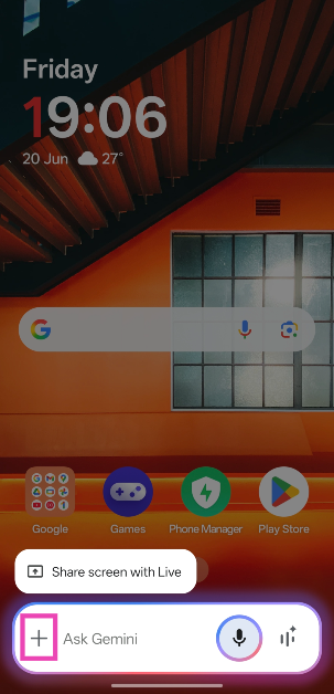 Ξεκινήστε την εφαρμογή Gemini στο τηλέφωνό σας, πατήστε το εικονίδιο κυματομορφής, πατήστε το εικονίδιο με ένα κουτί και βέλος, επιλέξτε αν θέλετε να μοιραστείτε μια εφαρμογή ή ολόκληρη την οθόνη και πατήστε 'SNAIRE SCREEM'. Εναλλακτικά, μπορείτε να πιέσετε μακράς το κουμπί και να επιλέξετε 'Share screen with live'.