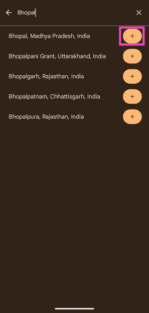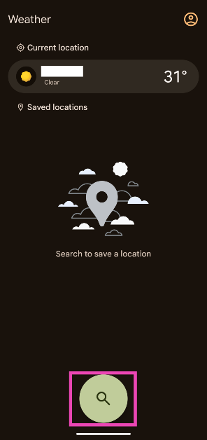 Ξεκινήστε την εφαρμογή καιρού στο τηλέφωνό σας, πατήστε το εικονίδιο αναζήτησης στο κάτω μέρος της οθόνης, αναζητήστε μια τοποθεσία και πατήστε το εικονίδιο συν δίπλα του.