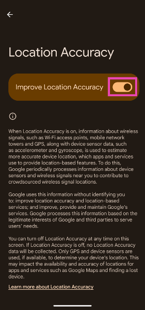 ΠηγαίνωΡυθμίσεις> Τοποθεσία> Υπηρεσίες τοποθεσίας> ακρίβεια τοποθεσίαςκαι ενεργοποιήστε το διακόπτη εναλλαγής δίπλα στο 'Βελτίωση της ακρίβειας της θέσης'.
