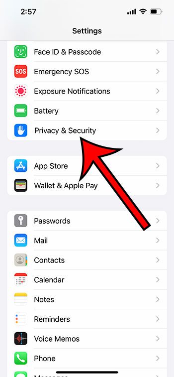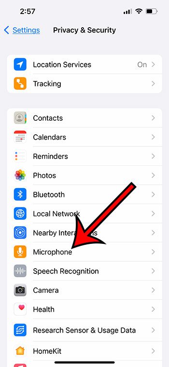 Τα βήματα σε αυτήν την παρακάτω ενότητα θα σας δείξουν πώς να βρείτε τη λίστα των εφαρμογών iPhone 13 που διαθέτουν δικαιώματα μικροφώνου, ώστε να μπορείτε να απενεργοποιήσετε τυχόν δικαιώματα που θέλετε να ανακαλέσετε.