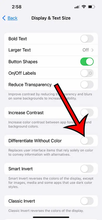 Μπορείτε να αλλάξετε αυτήν την επιλογή ενεργοποιώντας ή απενεργοποιώντας πηγαίνονταςΡυθμίσεις> Προσβασιμότητα> Εμφάνιση και μέγεθος κειμένου>Στη συνέχεια, πατώντας το κουμπί δίπλα στοΔιαφοροποιήστε χωρίς χρώμα.