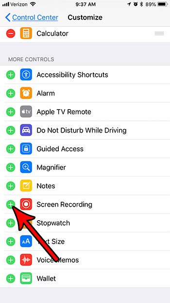 Εάν υπάρχει ένα πράσινο συν δίπλα στην επιλογή Recorder Screen, τότε θα το προσθέσετε στο κέντρο ελέγχου. Εάν υπάρχει κόκκινο μείον, τότε θα το αφαιρέσετε από το κέντρο ελέγχου.