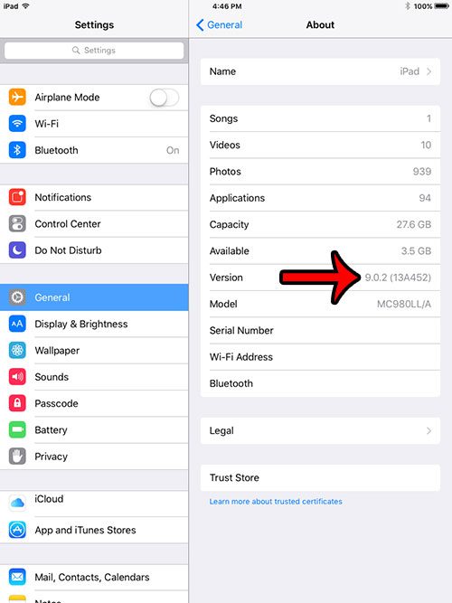 Βήμα 4: Εντοπίστε τις πληροφορίες έκδοσης λογισμικού στα δεξιάΕκδοχή. Στην παρακάτω εικόνα, το iPad εκτελεί την έκδοση iOS 9.0.2.