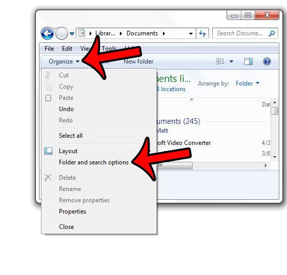 Βήμα 2: Κάντε κλικΟργανώνωΣτη μπλε μπαρ στο επάνω μέρος του παραθύρου, και στη συνέχεια κάντε κλικ στο κουμπίΕπιλογές φακέλου και αναζήτησης.