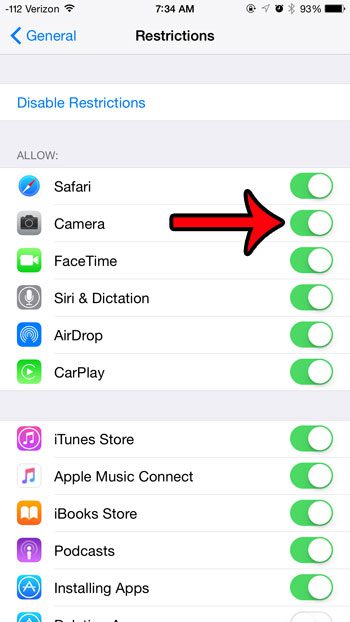 Ένα από τα χαρακτηριστικά που μπορούν να απενεργοποιηθούν από το μενού περιορισμών είναι η εφαρμογή κάμερας. Έτσι, εάν δεν μπορείτε να βρείτε την εφαρμογή κάμερας στο iPhone σας ή να χρησιμοποιήσετε οποιεσδήποτε λειτουργίες άλλων εφαρμογών που απαιτούν την κάμερα, τότε μπορεί να έχει περιοριστεί.