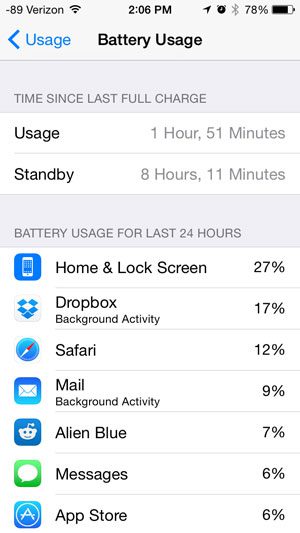 Τώρα μπορείτε να δείτε ποιες εφαρμογές χρησιμοποιούν την μεγαλύτερη διάρκεια ζωής της μπαταρίας στο iPhone σας 5 (για παράδειγμα, η οθόνη σας θα μπορούσε να χρησιμοποιεί πολλά αν έχετε επιλέξει να κρατήσετε την οθόνη iPhone μέχρι να το κλειδώσετε με το χέρι), επιτρέποντάς σας να δείτε αν υπάρχει κάτι που πραγματικά χύνει την μπαταρία και θα πρέπει να διαγραφεί ή εάν ξοδεύετε περισσότερο χρόνο και να καλέσετε ότι είχατε σκεφτεί προηγουμένως.