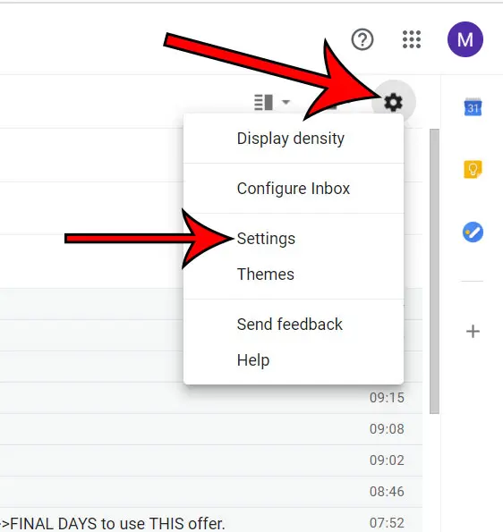 Βήμα 2: Κάντε κλικ στο εικονίδιο γραναζιών στην επάνω δεξιά πλευρά του παραθύρου και, στη συνέχεια, επιλέξτε τοΡυθμίσειςεπιλογή.
