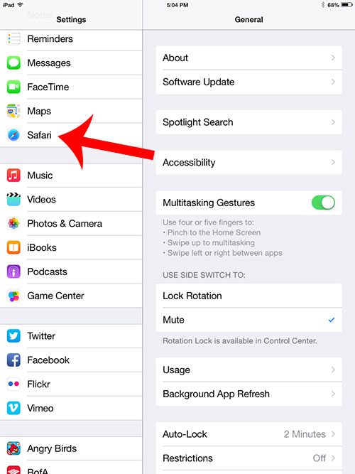 Βήμα 2: Μετακινηθείτε προς τα κάτω και επιλέξτε τοΣαφάριεπιλογή στη στήλη στην αριστερή πλευρά της οθόνης.
