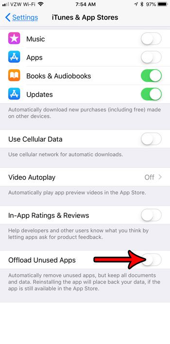 Βήμα 3: Μετακινηθείτε στο κάτω μέρος αυτού του μενού και πατήστε το κουμπί στα δεξιάΕκφόρτωση αχρησιμοποίητων εφαρμογώνΓια να απενεργοποιήσετε αυτήν τη ρύθμιση.