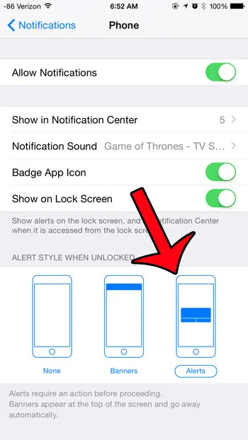 Στη συνέχεια, μπορείτε να διαμορφώσετε συγκεκριμένες επιλογές σχετικά με τον τρόπο με τον οποίο λαμβάνετε ειδοποιήσεις κλήσεων στη συσκευή. Για παράδειγμα, εάν θέλετε να λάβετε μια αναδυόμενη ειδοποίηση στο κέντρο της οθόνης σας όταν έχετε μια αναπάντητη κλήση, τότε επιλέξτε τοΕιδοποιήσειςεπιλογή κάτω από τοΣτυλ ειδοποίησης όταν ξεκλειδώνεταιΤμήμα του μενού.