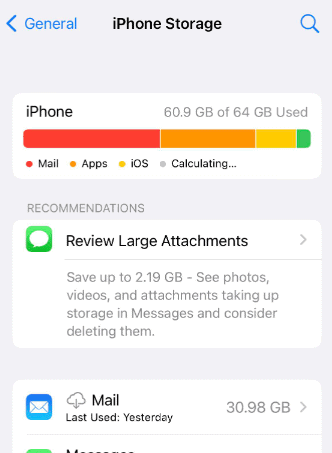 - Αποθηκευτικός χώρος:Η χαμηλή αποθήκευση μπορεί να εμποδίσει την απόδοση της εφαρμογής αλληλογραφίας. Ελευθερώστε λίγο χώρο διαγράφοντας αχρησιμοποίητες εφαρμογές, φωτογραφίες ή βίντεο.