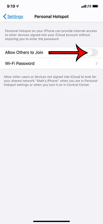 Βήμα 3: Πατήστε το κουμπί στα δεξιάΕπιτρέψτε σε άλλους να συμμετάσχουνγια να απενεργοποιήσετε το hotspot. Το μπλε σκίαση γύρω από το εικοσιτετράωρο πρέπει να φύγει τώρα.