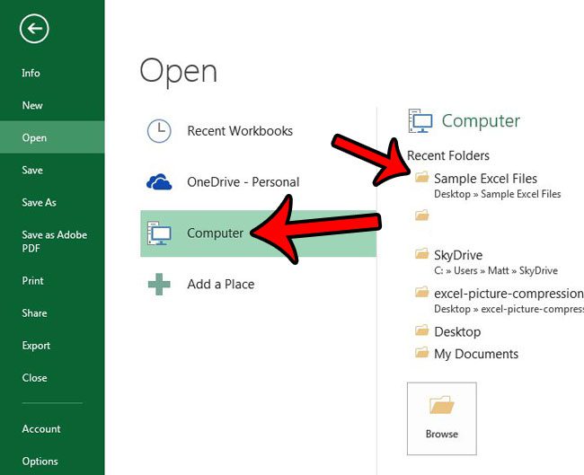 Όταν κάνετε κλικ στο άνοιγμα στο μενού του Excel Backstage, μπορείτε να επιλέξετε έναν από τους φακέλους στον υπολογιστή σας.