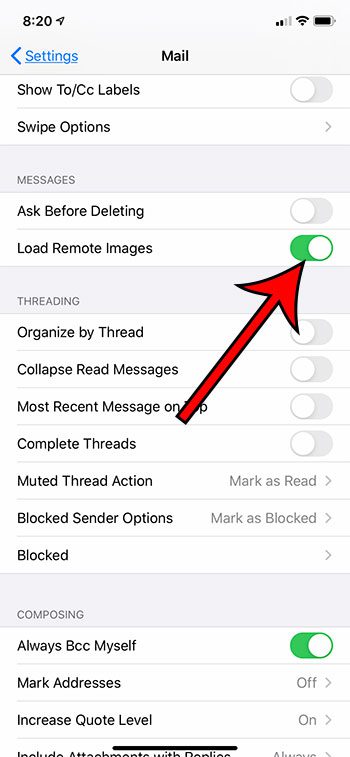 Ευτυχώς υπάρχει μια ρύθμιση για την εφαρμογή αλληλογραφίας στο iPhone σας που ονομάζεται "Load Remote Images" που μπορείτε να ενεργοποιήσετε, πράγμα που θα επιτρέψει την εμφάνιση αυτών των εικόνων όταν ανοίγετε τα email σας.
