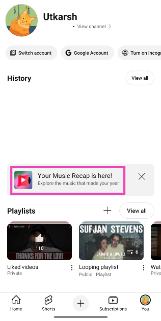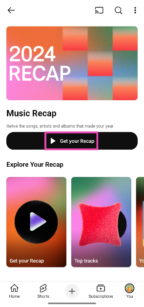 Μεταβείτε στην εφαρμογή YT Music και πατήστε το Banner Recap για να το δείτε. Εναλλακτικά, μπορείτε να μεταβείτε στην εφαρμογή YouTube και να δείτε την ανασκόπηση στην ενότητα "You".